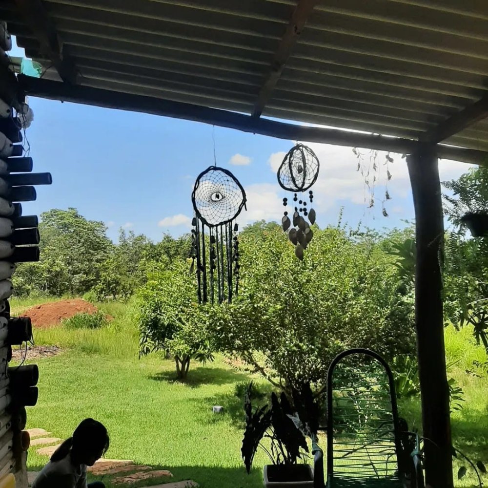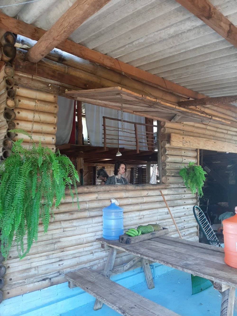 Na parte inferior da casa tem uma sala grande e cozinha, banheiro e varanda;